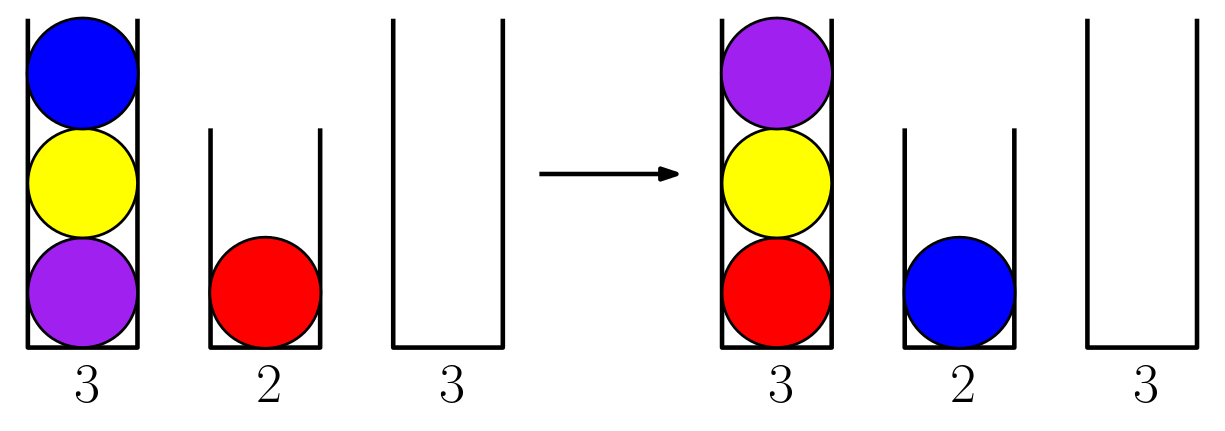 Du hast einige Behälter in die 2 oder 3 Bälle übereinander hinein passen; ein paar Bälle sind auch drin (siehe links). Wie kannst du, mit so wenig Ball-Verschiebungen wie möglich, die Behälter wie rechts befüllen?
