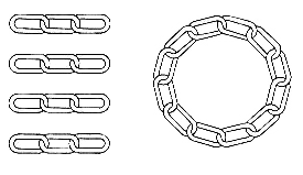 Verbinde die 4 Ketten, die jeweils aus 3 Ringen bestehen, zu einer langen ringförmigen Kette! Benutze dabei so wenige Auftrenn- und Zusammenfügeoperationen wie möglich.