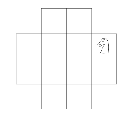 Wir haben ein $4 \times 4$ Schachbrett, bei denen alle 4 Ecken fehlen. Es gibt also $2 \times 2$ Felder in der Mitte, und weitere $8$ Felder außen herum. Auf einem der $8$ Felder steht ein Springer. Kann der Springer so ziehen (jeweils ein Feld gerade und eins diagonal, wie beim Schach), dass er jedes Feld genau einmal betritt und dann wieder auf dem Ausgangsfeld endet?