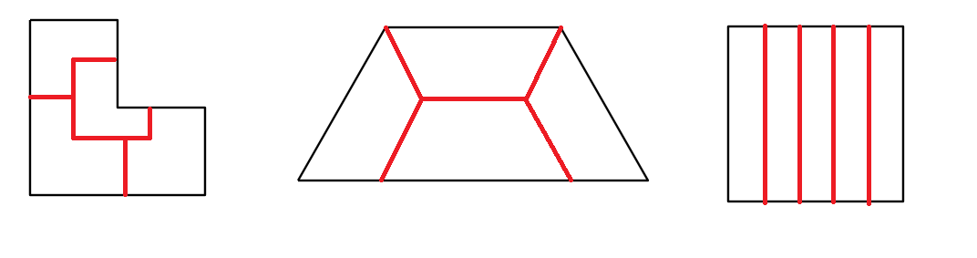 Kannst du die ersten beiden Polygone jeweils so in vier Teile zerschneiden, dass alle vier Teile die gleiche Form (eventuell gedreht und gespiegelt) haben? Kannst du das Quadrat in fünf Teile gleicher Form zerschneiden?