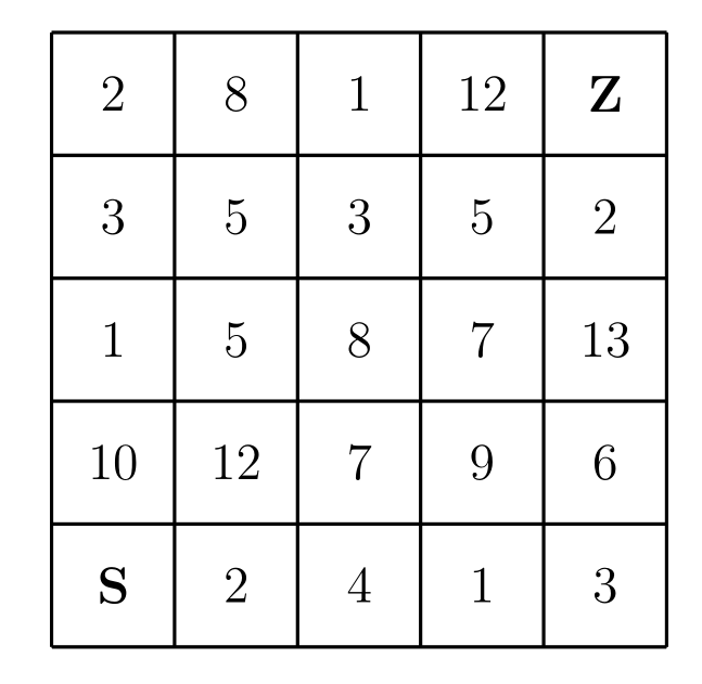 Du möchtest den Raum S mit einem Kabel mit dem Raum Z verbinden. Am wichtigsten ist, das Kabel so kurz wie möglich zu machen, d.h., dass so wenige Räume wie möglich durchquert werden. Die Kosten für die verschiedenen Räume sind in der Übersicht gegeben. Wie gelingt es dir am günstigsten?
