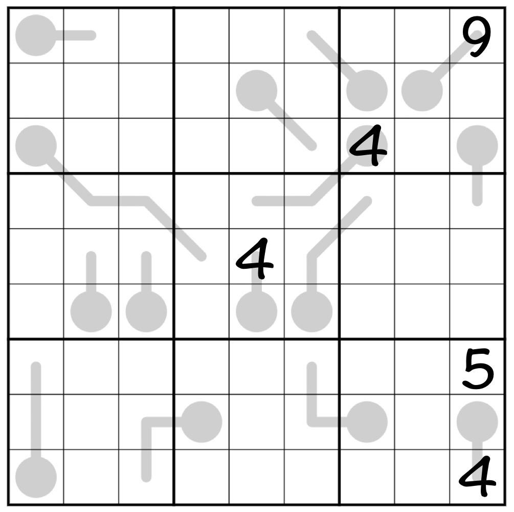Löse das folgende Sudoku. Dabei gelten die folgenden allgemeinen Sudoku-Regeln: Weiterhin gilt die folgende Thermometerregel.